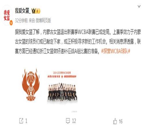 如今根据媒体人“我爱女篮”报道:“内蒙古女篮退出新赛季WCBA联赛已成定局。上赛季效力于内蒙古女篮的球员们或已敲定下家,或正积极寻求新的工作机会。相关消息源透露,联赛方面已经通知浙江女篮,做好递补征战A组比赛的准备。”